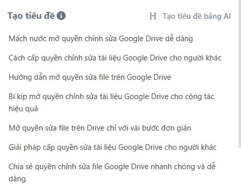 Công cụ này cho phép AI tạo một danh sách tiêu đề chuẩn SEO cho bạn lựa chọn dựa trên: Từ khoá, tiêu đề hiện tại, nội dung chính (Bạn bắt buộc phải có 1 trong 3 để chạy được)