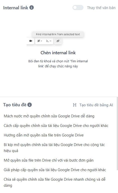 Đến thời điểm hiện tại, có 2 công cụ trong tab Kịch bản này là: Tìm internal link và tạo tiêu đề