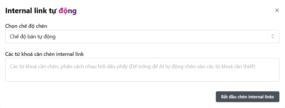 Semi-automatic mode: You specify the keywords for inserting internal links, the system will search for suitable internal links to insert into the keywords you have specified.