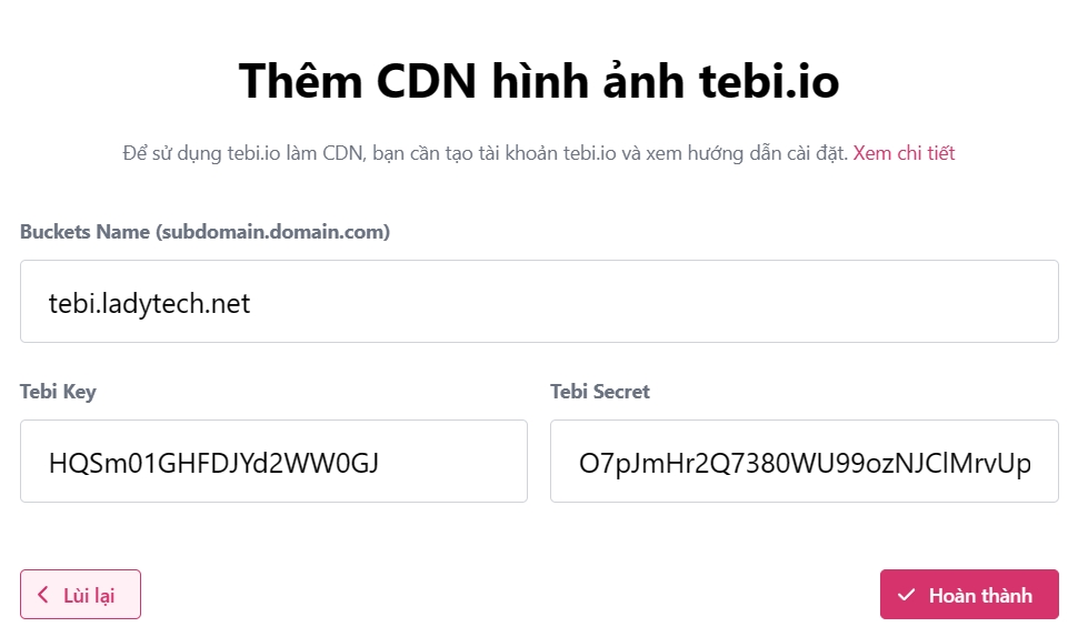 Enter the information as shown in the image below, then click Complete to save the settings. If you don't know how to access this, please refer to the previous section: Add CDN.